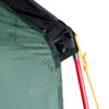 Палаткадостаточноустойчива, так как на внешнем тенте расположено четыре двухточечные оттяжки с системой динамической стабилизации. Оттяжкаодним концом крепится в верхней точке на тенте палатки, далее продевается через стальное кольцо и другим концом закрепляется ниже по тенту палатки. От кольца идет одиночная стропа оттяжки, которая крепится у земли. Петля может перемещаться в кольце, и вся конструкция имеет некоторую степень свободы, что позволяет палатке при порыве ветра немного качаться, сохраняя общую устойчивость и не вырывая колышки из земли. Оттяжки, регулируемые по длине, яркого цвета, чтобы их было видно даже ночью. Также необходимо закрепить палатку колышками по периметру, используя петли на палатке.
